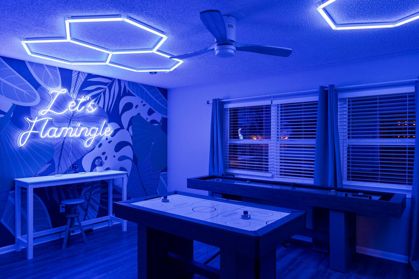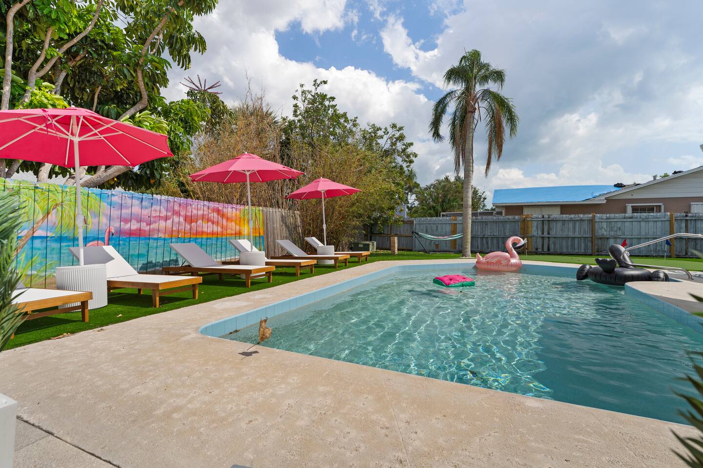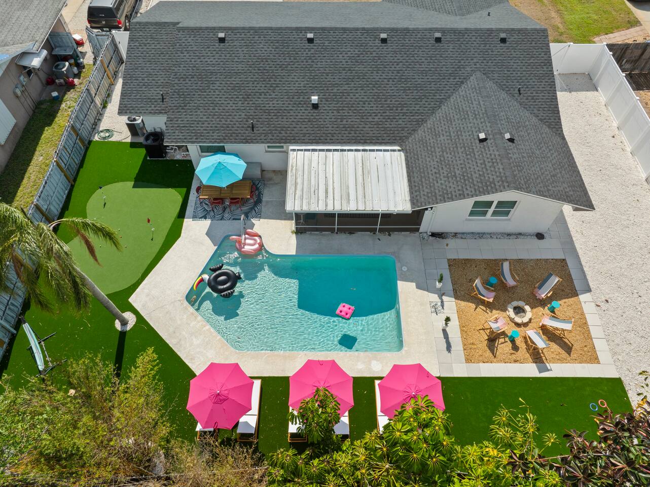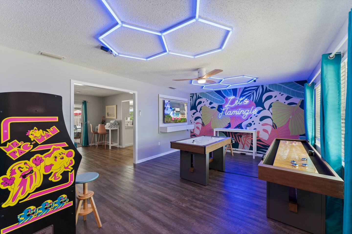 ⭐Outdoor Fun⭐ - Putting green featuring three holes set in comfortable artificial turf - Cozy hammock for that afternoon siesta - Extendable teak dining table with six chairs and umbrella—the perfect spot for an outdoor meal - Heated pool surrounded by six (6) lay-down, adjustable chaise lounges, with three (3) large umbrellas when you need a break from the Sun - Giant inflatable ride-on toucan & flamingo (don’t ya say!) as well as a Big Joe Captain’s Caddie Pool Float to keep those adult drinks from spilling - Fire pit surrounded by six (6) retro, adjustable sling chairs (think “hammock style”) to help you reach peak relaxation - Oversized outdoor games to enjoy, including: Connect 4, Jenga, Ring Toss - Propane BBQ Grill (propane included) with grilling utensils - Covered lanai provides the perfect spot for outdoor snacking at the bar top with two (2) high-top chairs or the 4-piece sofa seating arrangement ⭐Game Room Fun For All⭐ - NBA Jam Deluxe Arcade Machine - 2-Player with Wifi Online Multiplayer available - Ms. Pacman Deluxe Arcade Machine - 14 classic games, with Wifi Online Multiplayer available - 5-ft Air Powered Hockey Table with Electronic Scorer and Sound Effects - 9-ft Shuffleboard Table with 8 Puck Set - Floating Entertainment Center with 65” Roku-enabled TV Complementary ⭐1GB fiber⭐ Wifi is available at Let’s Flamingle. As you walk into the main living room, look for the Wifi Porter on the white counter table (with pink chairs), to quickly and easily connect to Wifi. Wake up with premium, authentic espresso to start your day the right way with the ⭐Nespresso⭐ Vertuo Coffee and Espresso Machine (with Aeroccino Milk Frother)! In as little as 15 minutes, you can craft up your favorite slushies or milkshakes using the ⭐ Ninja SLUSHi ⭐ — great for fun family drinks or cocktails by the pool ⭐The Essentials⭐ - Shampoo, Conditioner, Body Wash - Terra Pure Green Tea mounted in each shower - this line is infused with organic aloe, honey, and olive oil, with a fresh Green Tea fragrance. - Liquid Soap - Public Goods at each sink - Carefully considered high quality, natural and healthy ingredients, including essential oils of orange, geranium, cinnamon, mandarin, nutmeg, petitgrain, rosewood, celery seed, grapefruit and vetiver. - Dish Soap - Extra bed linens, pillows, and blankets - Towels — bath and pool - Hair dryer(s) - Toaster, pots & pans, and all the cooking basics - Mini-bar with cocktail shaker, ice bucket, and bar tool set (bottle opener, muddler, strainer and double-sided jigger) - Super sleek standing desk with powered height adjustment feature with three options: 1) standing, sitting in sleek, ergonomic office chair, or 3) under-desk walking treadmill - Towel rack & folding luggage rack for each bedroom - Travel crib provided for the little ones with fitted sheet (BABYBJORN)