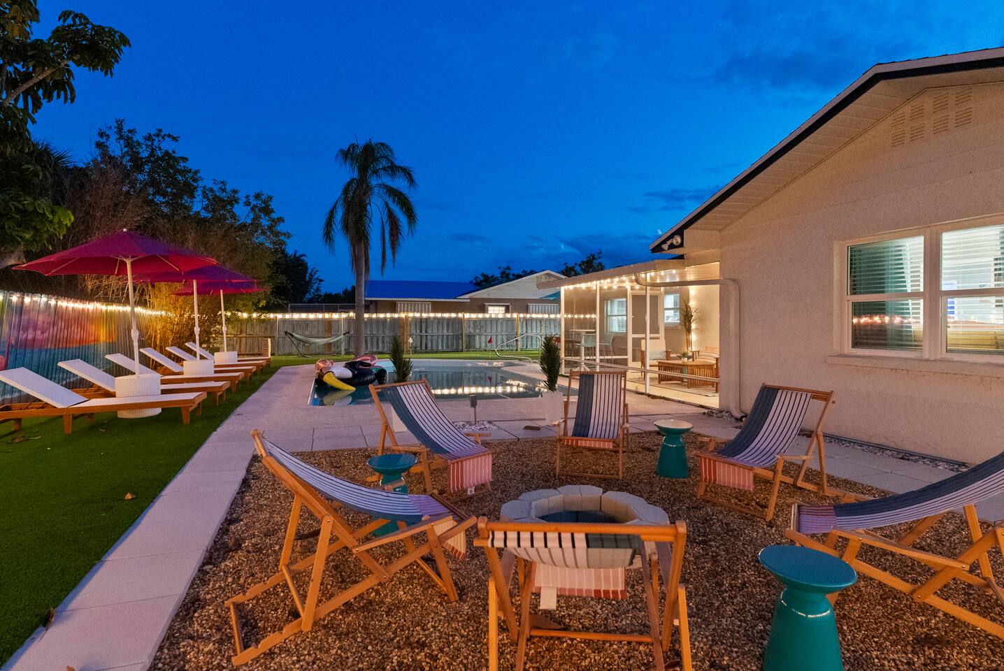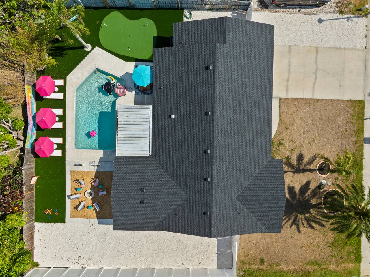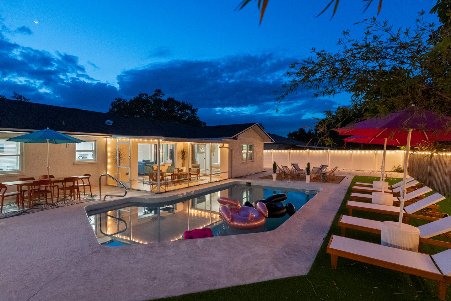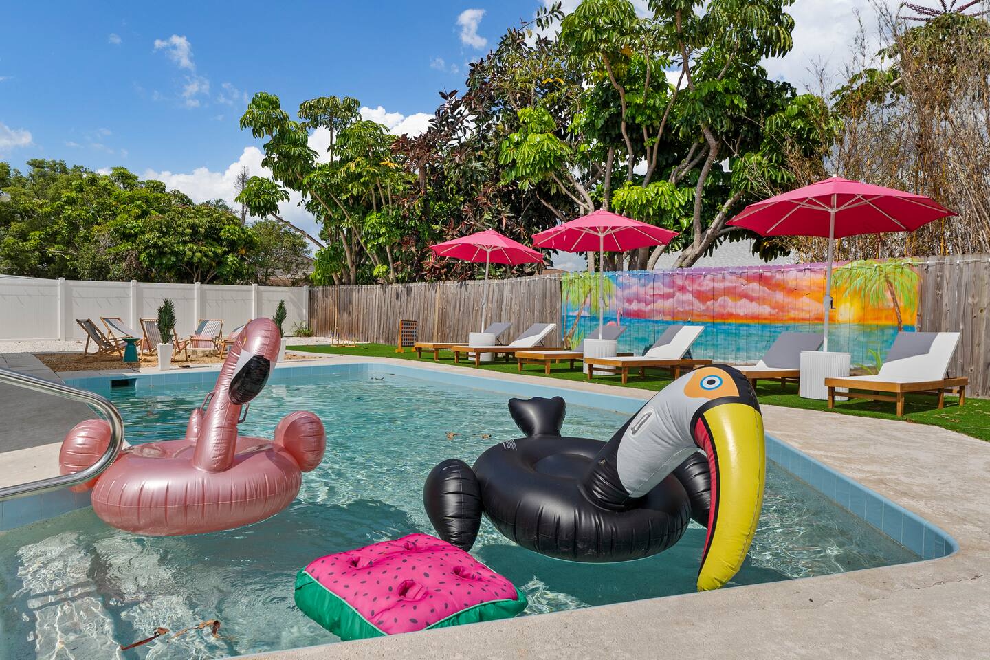 ⭐Outdoor Fun⭐ - Putting green featuring three holes set in comfortable artificial turf - Cozy hammock for that afternoon siesta - Extendable teak dining table with six chairs and umbrella—the perfect spot for an outdoor meal - Heated pool surrounded by six (6) lay-down, adjustable chaise lounges, with three (3) large umbrellas when you need a break from the Sun - Giant inflatable ride-on toucan & flamingo (don’t ya say!) as well as a Big Joe Captain’s Caddie Pool Float to keep those adult drinks from spilling - Fire pit surrounded by six (6) retro, adjustable sling chairs (think “hammock style”) to help you reach peak relaxation - Oversized outdoor games to enjoy, including: Connect 4, Jenga, Ring Toss - Propane BBQ Grill (propane included) with grilling utensils - Covered lanai provides the perfect spot for outdoor snacking at the bar top with two (2) high-top chairs or the 4-piece sofa seating arrangement ⭐Game Room Fun For All⭐ - NBA Jam Deluxe Arcade Machine - 2-Player with Wifi Online Multiplayer available - Ms. Pacman Deluxe Arcade Machine - 14 classic games, with Wifi Online Multiplayer available - 5-ft Air Powered Hockey Table with Electronic Scorer and Sound Effects - 9-ft Shuffleboard Table with 8 Puck Set - Floating Entertainment Center with 65” Roku-enabled TV Complementary ⭐1GB fiber⭐ Wifi is available at Let’s Flamingle. As you walk into the main living room, look for the Wifi Porter on the white counter table (with pink chairs), to quickly and easily connect to Wifi. Wake up with premium, authentic espresso to start your day the right way with the ⭐Nespresso⭐ Vertuo Coffee and Espresso Machine (with Aeroccino Milk Frother)! In as little as 15 minutes, you can craft up your favorite slushies or milkshakes using the ⭐ Ninja SLUSHi ⭐ — great for fun family drinks or cocktails by the pool ⭐The Essentials⭐ - Shampoo, Conditioner, Body Wash - Terra Pure Green Tea mounted in each shower - this line is infused with organic aloe, honey, and olive oil, with a fresh Green Tea fragrance. - Liquid Soap - Public Goods at each sink - Carefully considered high quality, natural and healthy ingredients, including essential oils of orange, geranium, cinnamon, mandarin, nutmeg, petitgrain, rosewood, celery seed, grapefruit and vetiver. - Dish Soap - Extra bed linens, pillows, and blankets - Towels — bath and pool - Hair dryer(s) - Toaster, pots & pans, and all the cooking basics - Mini-bar with cocktail shaker, ice bucket, and bar tool set (bottle opener, muddler, strainer and double-sided jigger) - Super sleek standing desk with powered height adjustment feature with three options: 1) standing, sitting in sleek, ergonomic office chair, or 3) under-desk walking treadmill - Towel rack & folding luggage rack for each bedroom - Travel crib provided for the little ones with fitted sheet (BABYBJORN)