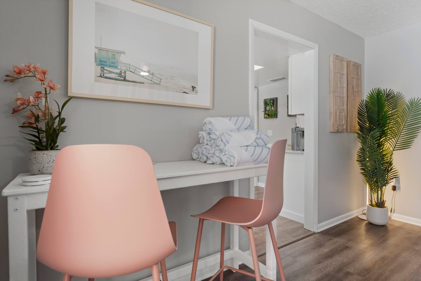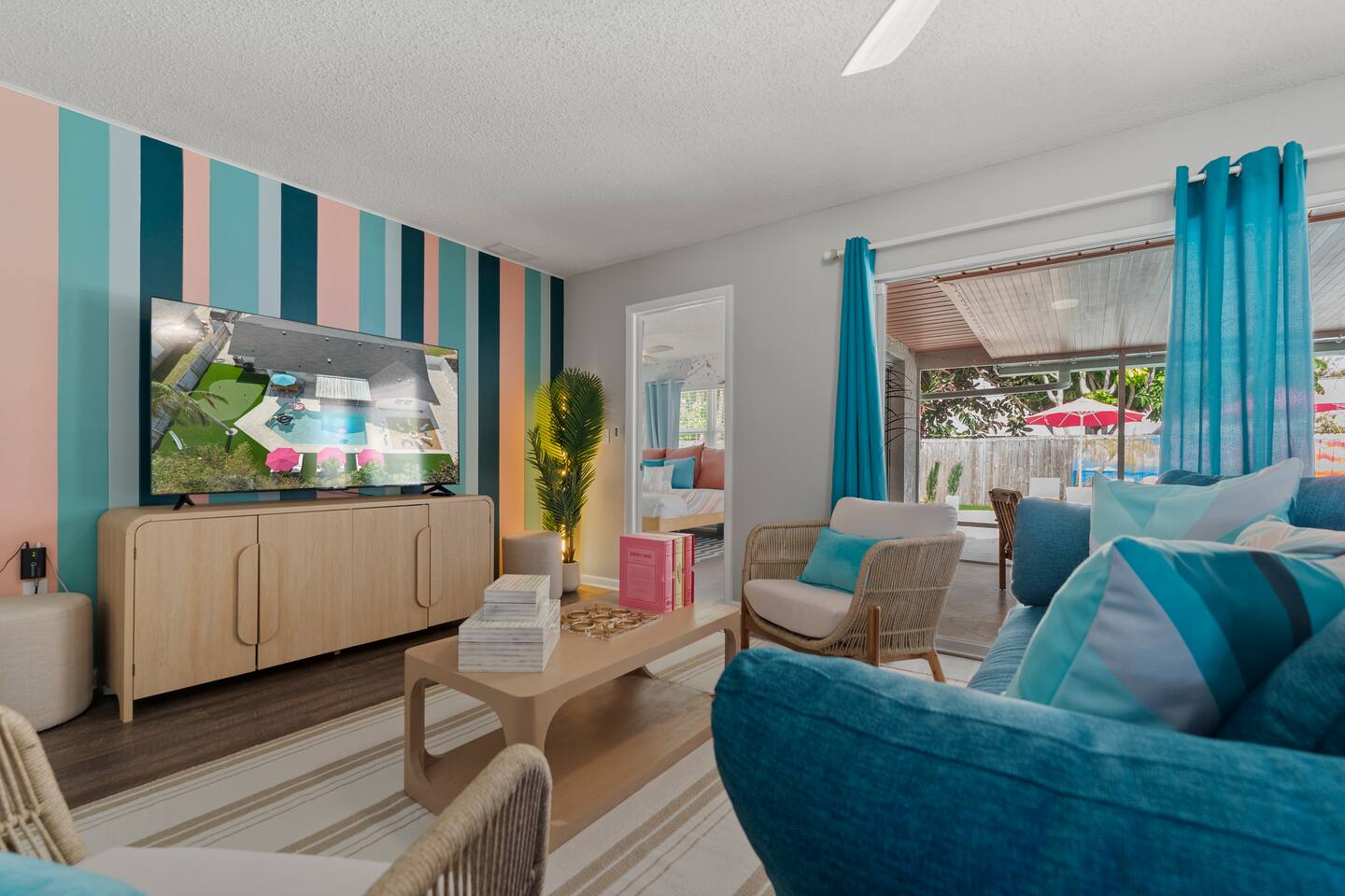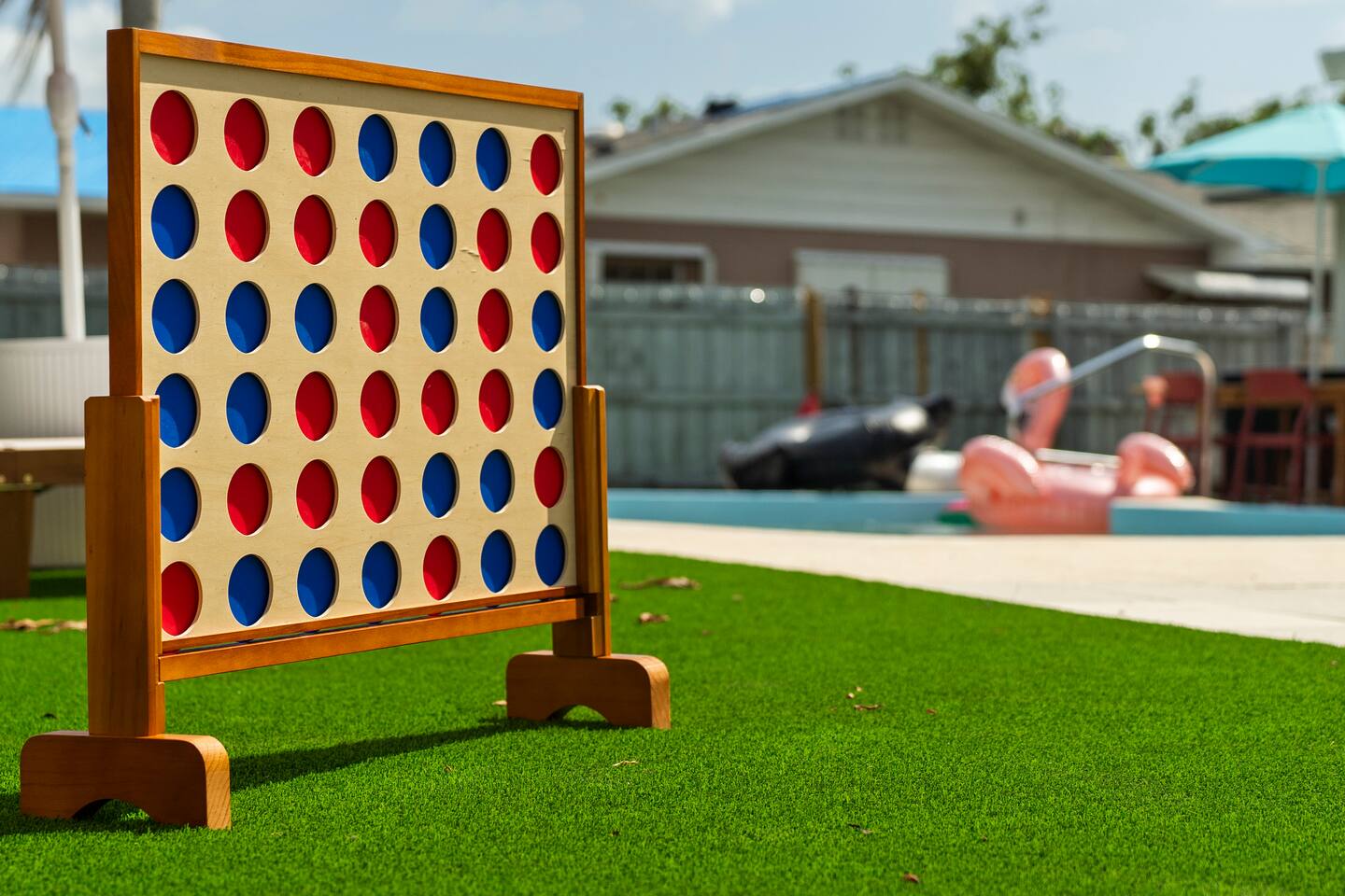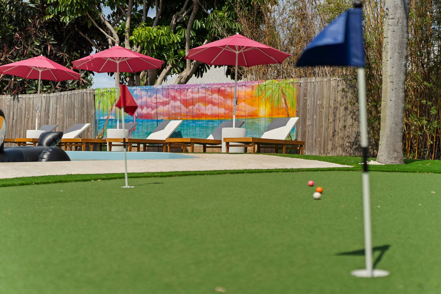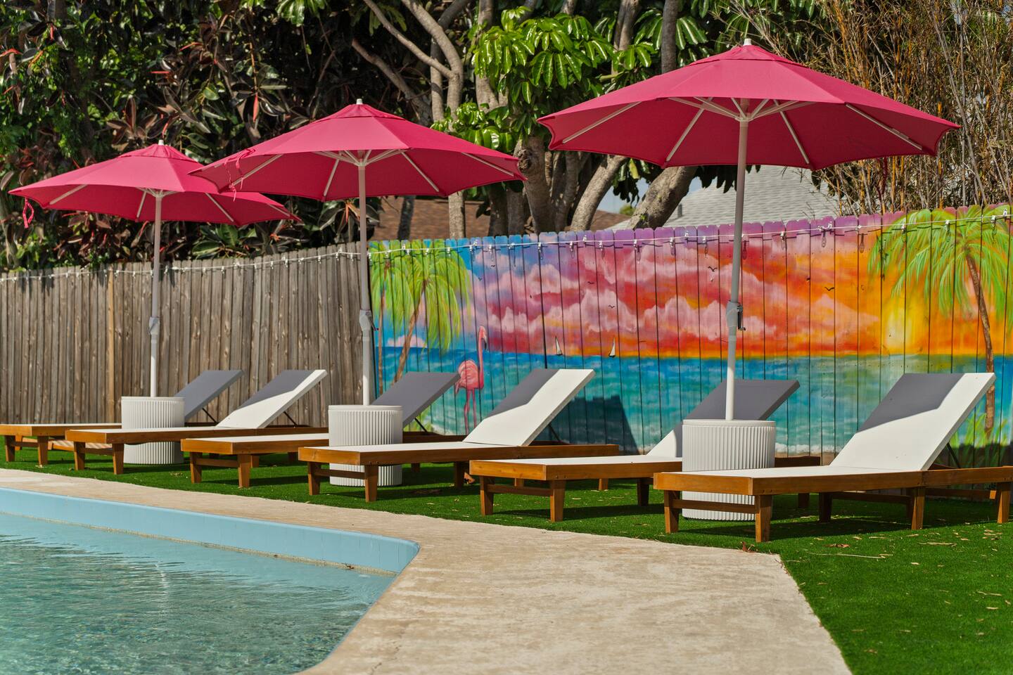 ⭐Outdoor Fun⭐ - Putting green featuring three holes set in comfortable artificial turf - Cozy hammock for that afternoon siesta - Extendable teak dining table with six chairs and umbrella—the perfect spot for an outdoor meal - Heated pool surrounded by six (6) lay-down, adjustable chaise lounges, with three (3) large umbrellas when you need a break from the Sun - Giant inflatable ride-on toucan & flamingo (don’t ya say!) as well as a Big Joe Captain’s Caddie Pool Float to keep those adult drinks from spilling - Fire pit surrounded by six (6) retro, adjustable sling chairs (think “hammock style”) to help you reach peak relaxation - Oversized outdoor games to enjoy, including: Connect 4, Jenga, Ring Toss - Propane BBQ Grill (propane included) with grilling utensils - Covered lanai provides the perfect spot for outdoor snacking at the bar top with two (2) high-top chairs or the 4-piece sofa seating arrangement ⭐Game Room Fun For All⭐ - NBA Jam Deluxe Arcade Machine - 2-Player with Wifi Online Multiplayer available - Ms. Pacman Deluxe Arcade Machine - 14 classic games, with Wifi Online Multiplayer available - 5-ft Air Powered Hockey Table with Electronic Scorer and Sound Effects - 9-ft Shuffleboard Table with 8 Puck Set - Floating Entertainment Center with 65” Roku-enabled TV Complementary ⭐1GB fiber⭐ Wifi is available at Let’s Flamingle. As you walk into the main living room, look for the Wifi Porter on the white counter table (with pink chairs), to quickly and easily connect to Wifi. Wake up with premium, authentic espresso to start your day the right way with the ⭐Nespresso⭐ Vertuo Coffee and Espresso Machine (with Aeroccino Milk Frother)! In as little as 15 minutes, you can craft up your favorite slushies or milkshakes using the ⭐ Ninja SLUSHi ⭐ — great for fun family drinks or cocktails by the pool ⭐The Essentials⭐ - Shampoo, Conditioner, Body Wash - Terra Pure Green Tea mounted in each shower - this line is infused with organic aloe, honey, and olive oil, with a fresh Green Tea fragrance. - Liquid Soap - Public Goods at each sink - Carefully considered high quality, natural and healthy ingredients, including essential oils of orange, geranium, cinnamon, mandarin, nutmeg, petitgrain, rosewood, celery seed, grapefruit and vetiver. - Dish Soap - Extra bed linens, pillows, and blankets - Towels — bath and pool - Hair dryer(s) - Toaster, pots & pans, and all the cooking basics - Mini-bar with cocktail shaker, ice bucket, and bar tool set (bottle opener, muddler, strainer and double-sided jigger) - Super sleek standing desk with powered height adjustment feature with three options: 1) standing, sitting in sleek, ergonomic office chair, or 3) under-desk walking treadmill - Towel rack & folding luggage rack for each bedroom - Travel crib provided for the little ones with fitted sheet (BABYBJORN)